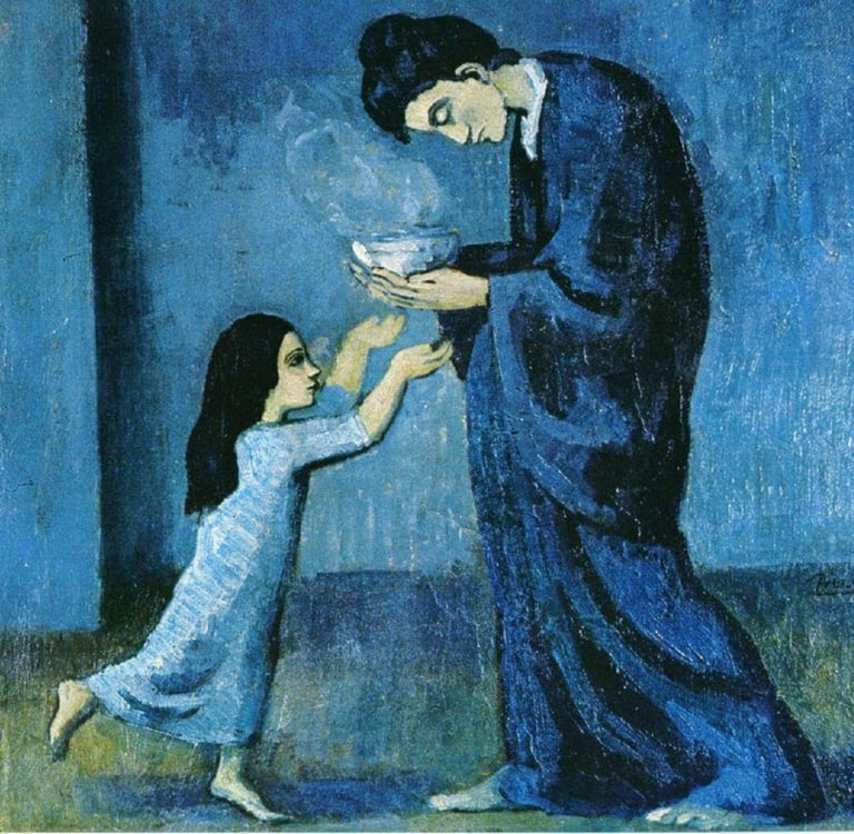 O Período Azul de Picasso, que ocorreu entre 1901 e 1904, é caracterizado por uma paleta de tons frios, predominantemente azuis e verdes. Esse período é amplamente associado à tristeza e à solidão, refletindo as experiências pessoais do artista, incluindo a morte de seu amigo Carlos Casagemas. As obras desse período retratam figuras solitárias, marginalizadas e em situações de desespero.