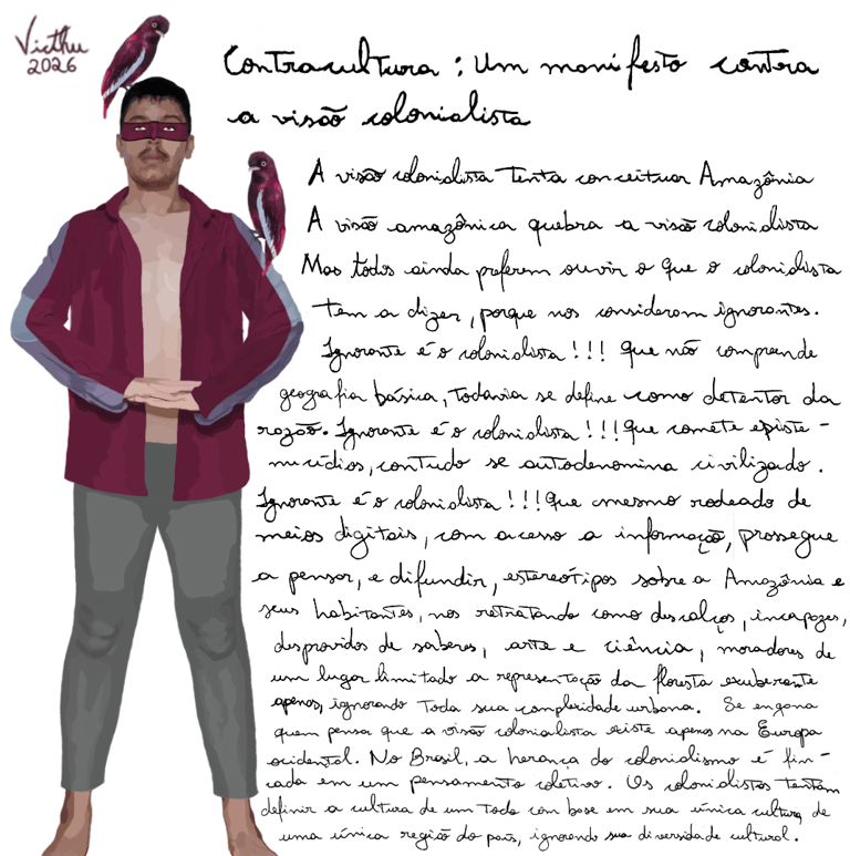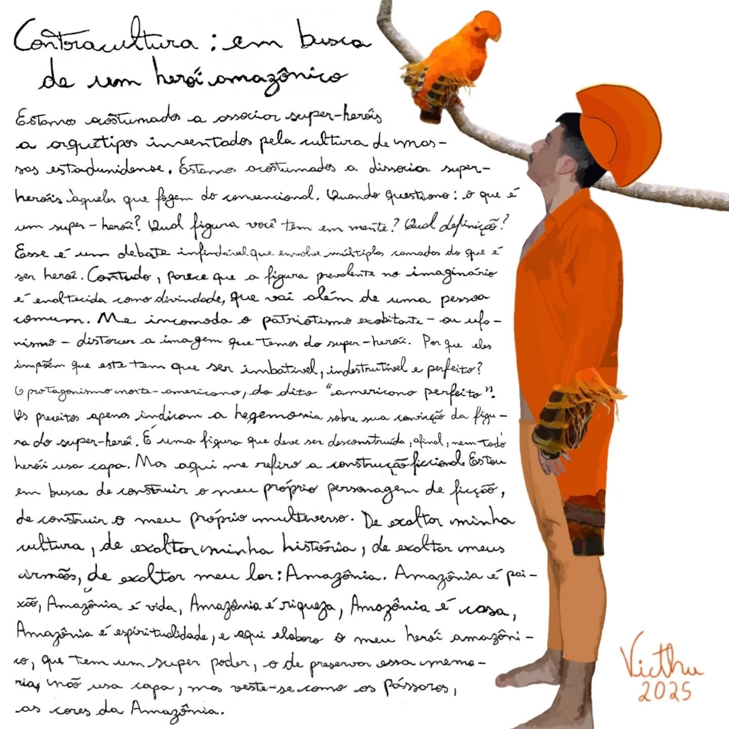 Victor Hugo Reis, conhecido como Victhu, é um artista visual cuja trajetória ressignifica a relação entre identidade pessoal e cultural. Licenciado pela UFAM, atualmente é mestre em Sociedade e Cultura na Amazônia e cursa doutorado em Artes Visuais pela Unicamp; seu trabalho dialoga com temas amazônicos, políticos e existenciais. Valendo-se de múltiplas linguagens, pintura, desenho, fotografia e arte digital, Victhu desafia limites criativos desde 2017, quando iniciou na arte digital. Suas obras, algumas integrando a Pinacoteca do Amazonas, transcendem a verbalidade, revelando um universo introspectivo que ressoa de maneira universal.