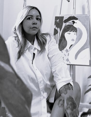 Carolina é artista visual formada em Design de Moda. Cresceu cercada por arte, música e referências visuais, construindo um trabalho sensível e autoral. Seu universo criativo une a figura feminina e a botânica, explorando temas como conexão, identidade e emoção.