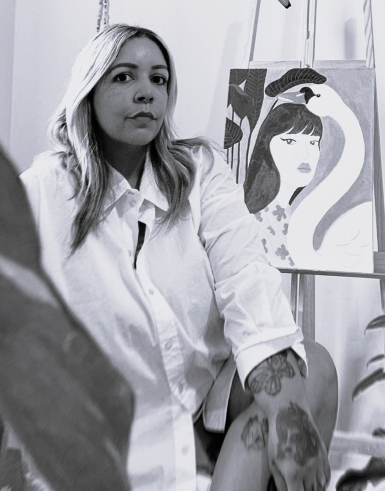 Designer gráfica e ilustradora, explora a luz, o gesto e a cor como pilares da construção da imagem, criando obras que transitam entre o figurativo e o simbólico. Com origem no universo da moda e do design de superfícies, entende a criação como um processo que começa no gesto do artista e se completa no olhar e no uso do outro princípio que também orienta sua pintura.