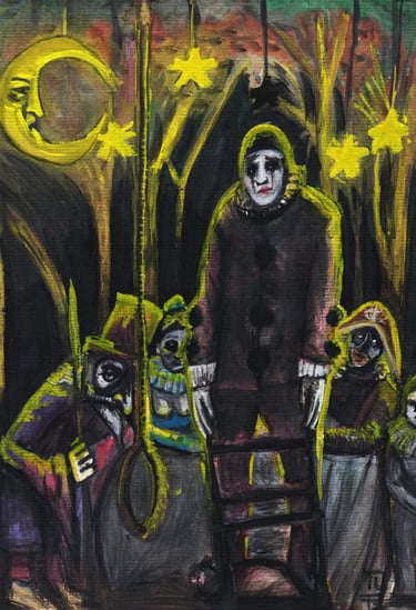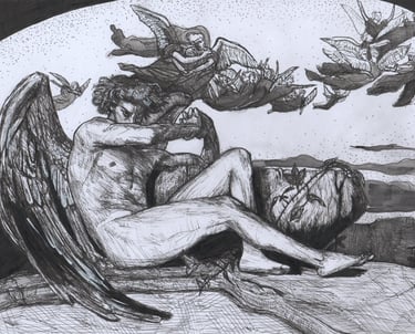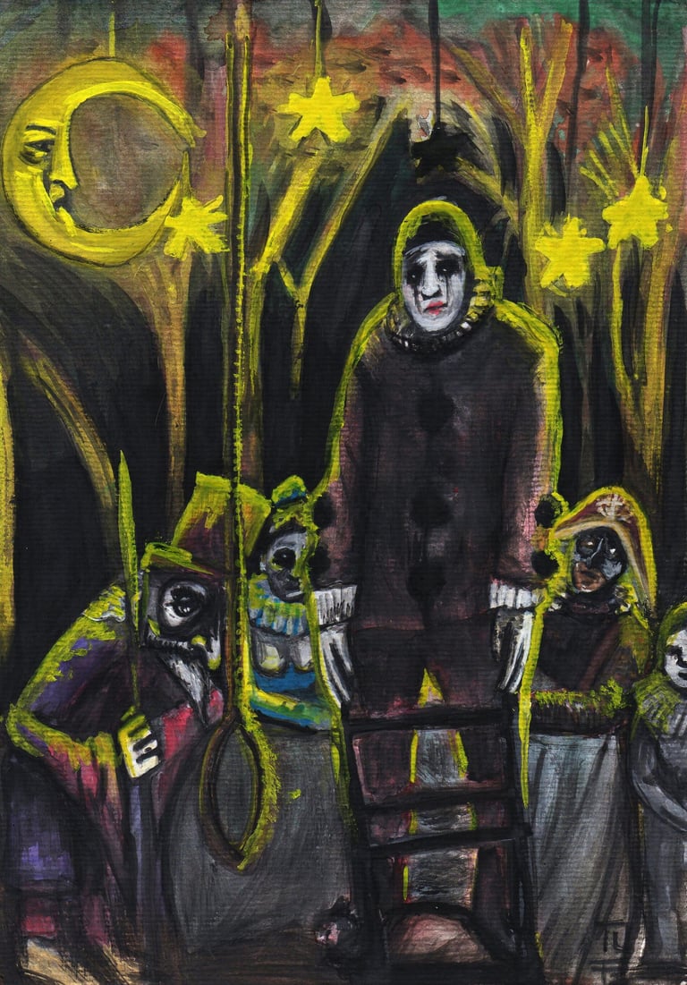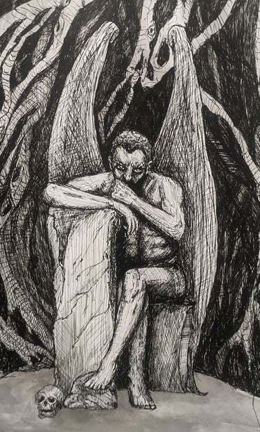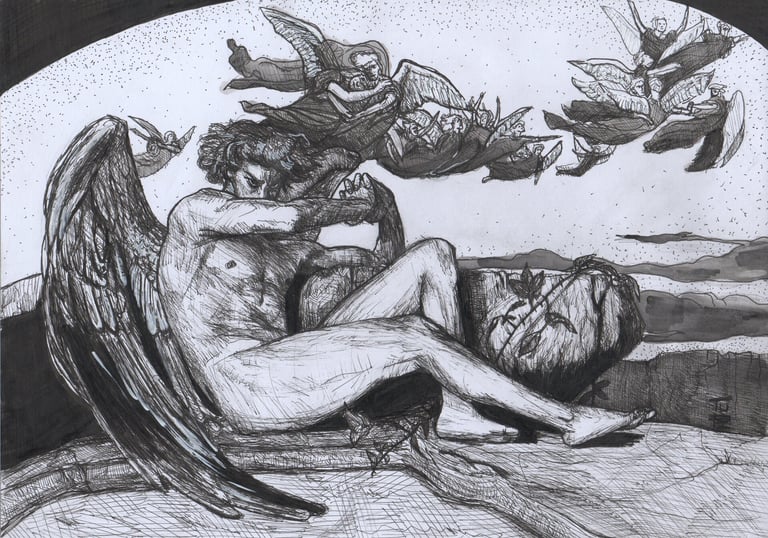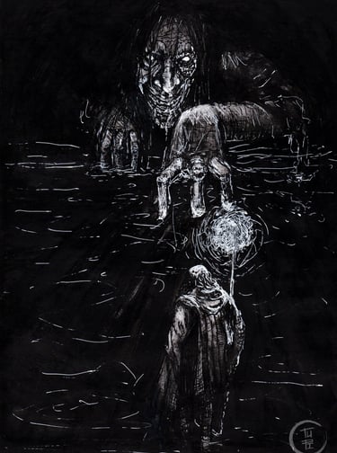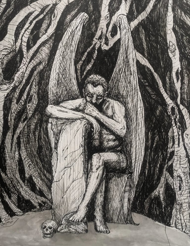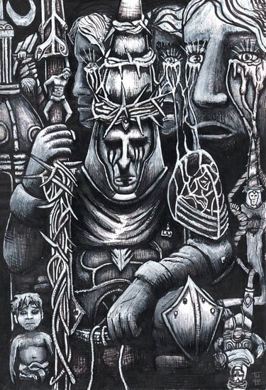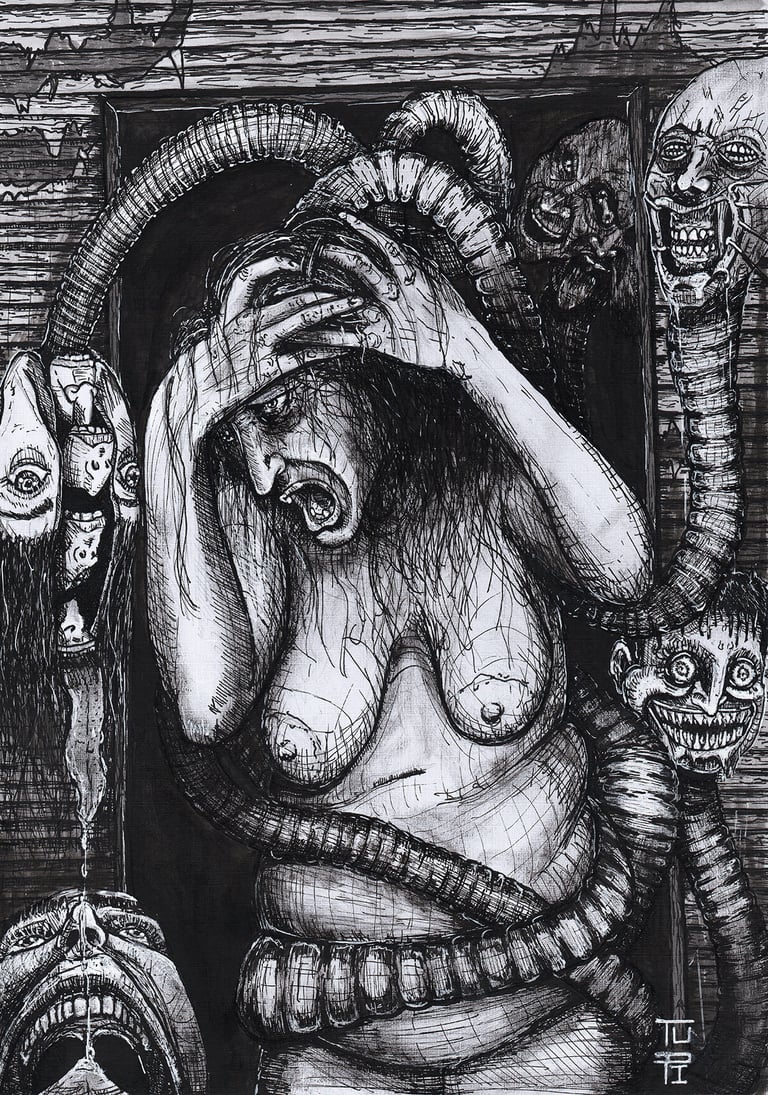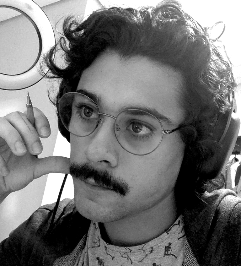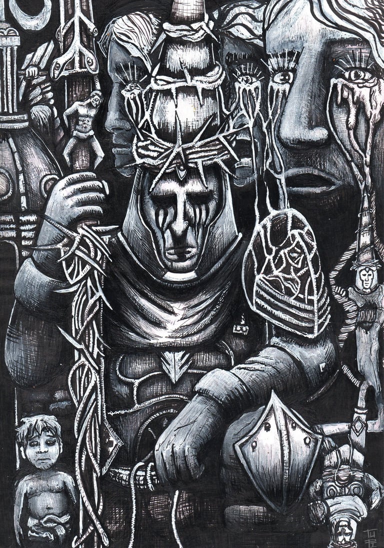 Gustavo Leite (1997) é artista autodidata e designer gráfico. Desde criança apaixonado por desenhar, começou vendendo ilustrações de animes no recreio escolar. Com o tempo, expandiu sua prática para pintura em tela, explorando guache, acrílica e modelagem 3D. Inspirado por artistas como Goya, Otto Dix, Bosch, Portinari, Kentaro Miura, Takehiko Inoue e Junji Ito, encontrou força no caos e no lado obscuro da humanidade. Atualmente, trabalha sobretudo com nanquim e inicia incursões em óleo, explorando medos, falhas e preconceitos da sociedade.