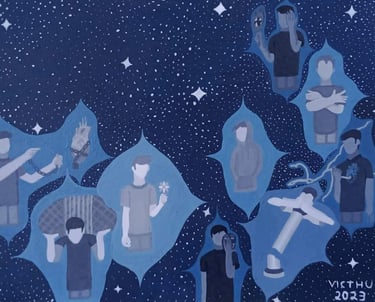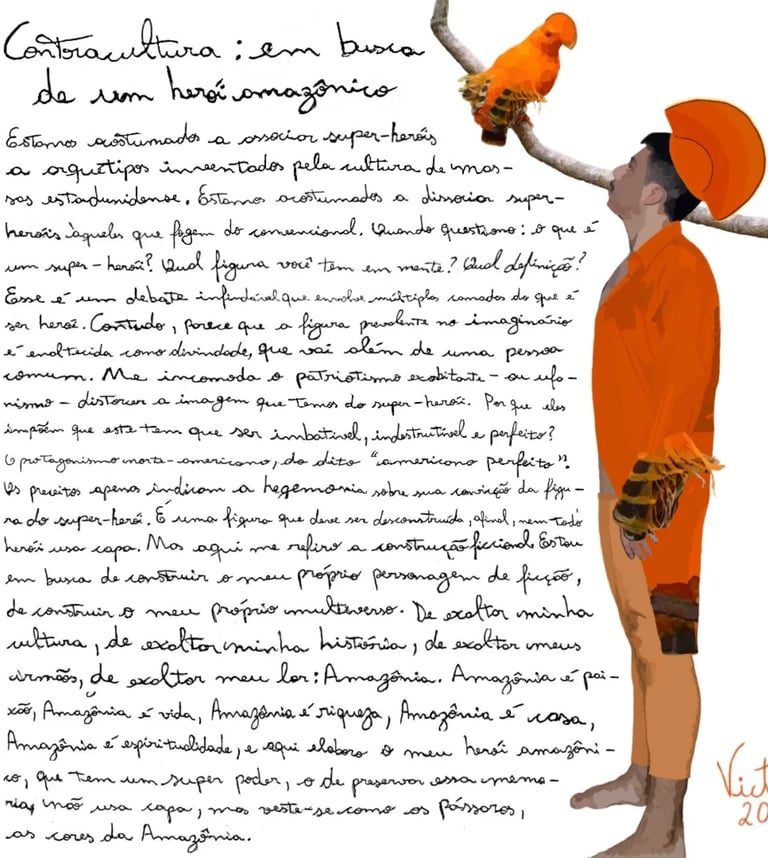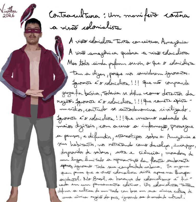 Victor Hugo Reis, conhecido como Victhu, é um artista visual cuja trajetória ressignifica a relação entre identidade pessoal e cultural. Licenciado pela UFAM, atualmente é mestre em Sociedade e Cultura na Amazônia e cursa doutorado em Artes Visuais pela Unicamp; seu trabalho dialoga com temas amazônicos, políticos e existenciais. Valendo-se de múltiplas linguagens, pintura, desenho, fotografia e arte digital, Victhu desafia limites criativos desde 2017, quando iniciou na arte digital. Suas obras, algumas integrando a Pinacoteca do Amazonas, transcendem a verbalidade, revelando um universo introspectivo que ressoa de maneira universal.